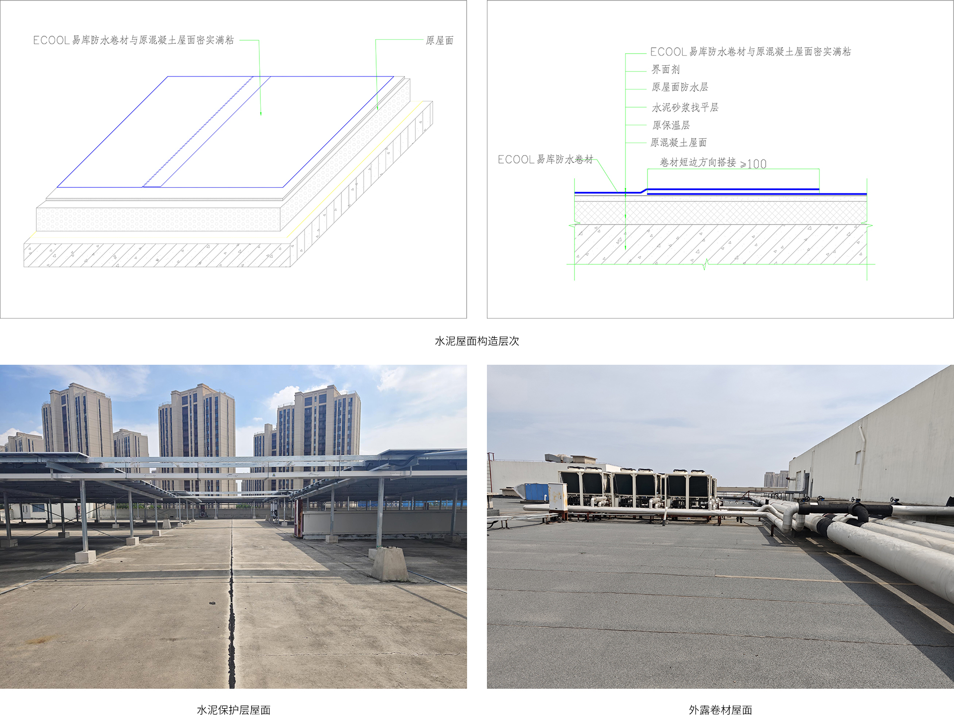 ECOOL易庫(kù)高耐候隔熱防水卷材應(yīng)用于屋面水泥防水隔熱工程,可以有效解決老舊水泥房屋的防水防潮問題。